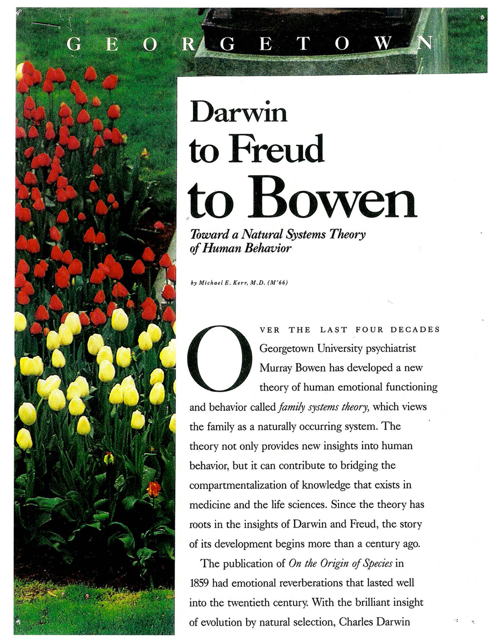 Over the last four decades Georgetown University psychiatrist Murray Bowen has developed a new theory of human emotional functioning and behavior call family systems theory, which views the family as a naturally occurring system. The theory not only proves new insights into human behavior, but it can contribute to bridging the compartmentalization of knowledge that exists in medicine and the life sciences. Since the theory has roots in the insights of Darwin and Freud, the story of its development begins more than a century ago."